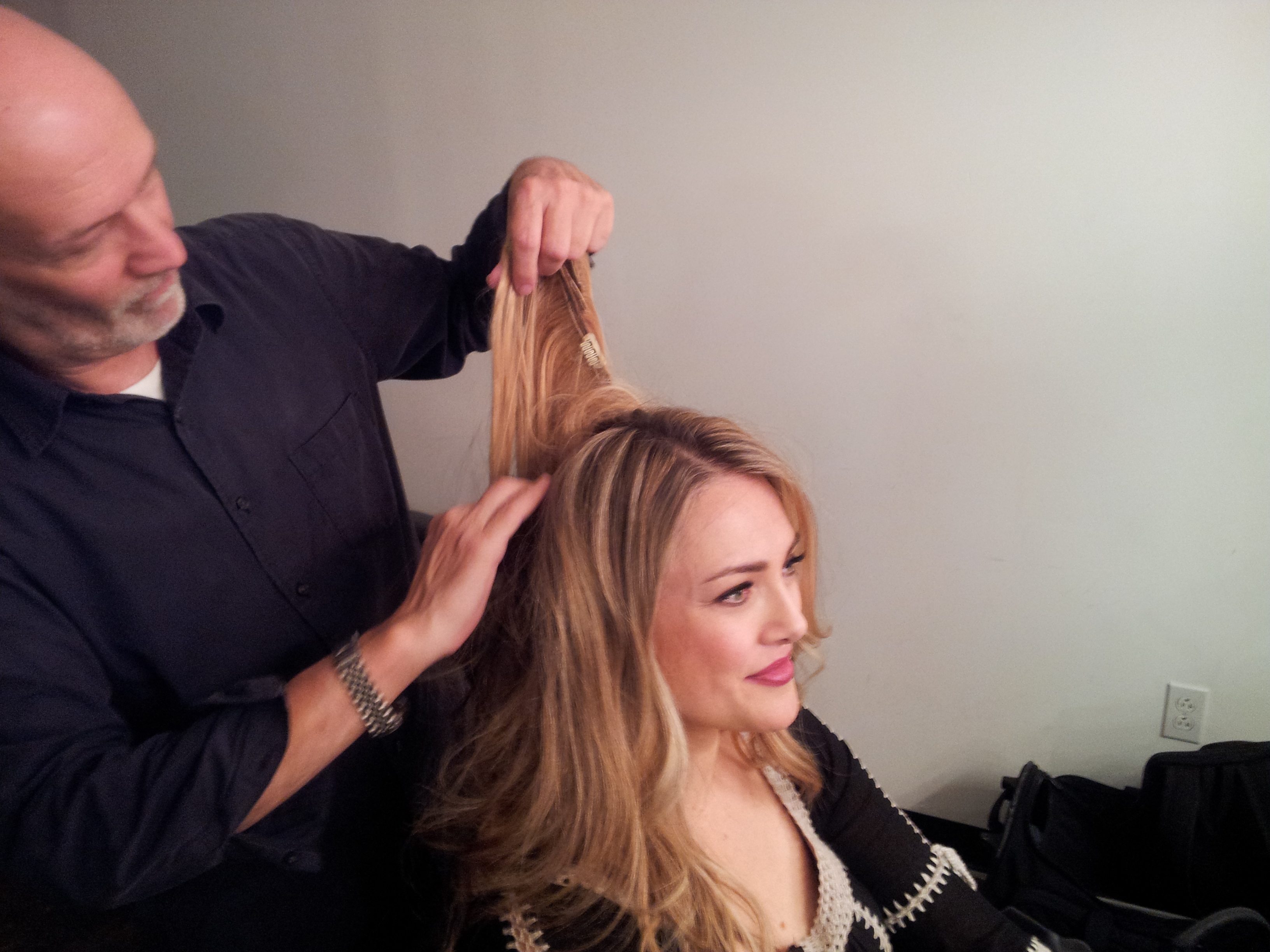 On occasion, when a client likes to use the wind machine and they love good hair, the hair and make-up artist will add some additional hair pieces to my own hair to fill in the gaps or the holes that the wind machine can create.